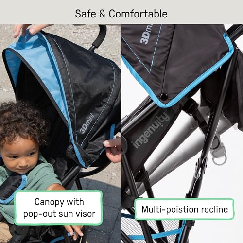 Ingenuity 3D Mini Convenience Stroller – Lightweight Stroller with Compact Fold, Multi-Position Recline, Canopy with Pop Out Sun Visor – Umbrella Stroller for Travel & More, Blue/Black