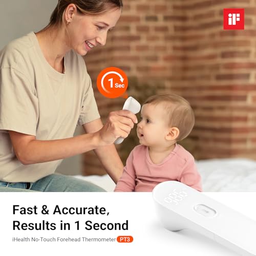 iHealth No-Touch Forehead Thermometer for Adults, Kids, Babies – 1s Fast Accurate, 3 Ultra-Sensitive Sensors, Quiet Vibration Feedback, Digital Large LED Digits, Easy to Use for Home & Nurses, PT3