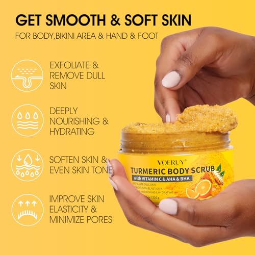 【EXFOLIATING & MOISTURIZING SCRUB】Our turmeric vc body scrub exfoliating body scrub is formulated with skin loving ingredients including AHA&BHA for their benefits on skin, can be used as a body exfoliator scrub, bikini scrub and foot scrub. It is a dual function body and foot exfoliator. Removing dead skin, removes dull, dry skin to reveal soft and smooth skin