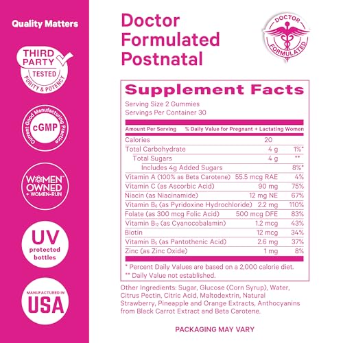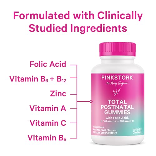 Pink Stork Postnatal Vitamin Gummies – Daily Multivitamin for Women After Pregnancy – Postpartum Recovery & Breastfeeding Support – Folic Acid, B6, B12, Vitamin C, Biotin & Zinc – 60 Gummies