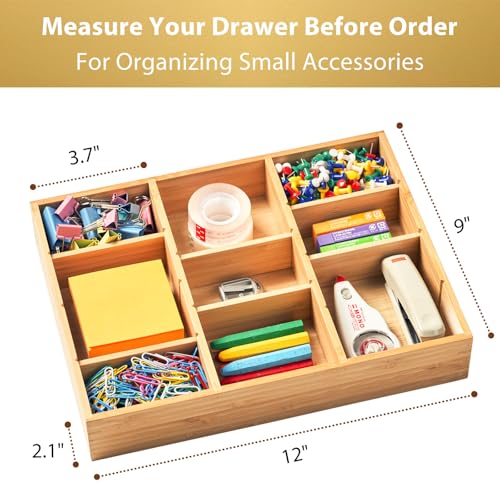 Umilife Desk Drawer Organizer, Bamboo Wood Organizer Tray with Adjustable Compartments, Office Desk Accessories Supplies Organization Storage, 12″ x 9″
