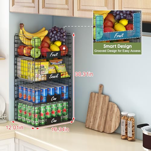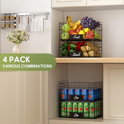 JKsmart 4 Pack XXL Stackable Wire Baskets with Handles for Pantry Storage and Organization,Fruit and Vegetable Basket with Name Plates,Metal Storage Bins for Snack Can Fruit Veggies
