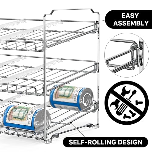 Rolling, Easy-Access Design: Metal rack features angled shelves that automatically roll cans forward for first-in-first-out access