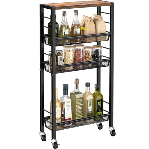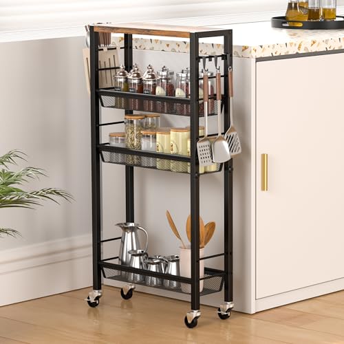Maximize space utilization with the rolling carts: This 4-tier narrow kitchen storage cart can conquer small spaces and is the ultimate solution for storage. The rolling cart can effortlessly slide into well-known narrow areas, such as between kitchen counters and refrigerators, transforming wasted space into powerful storage space