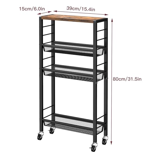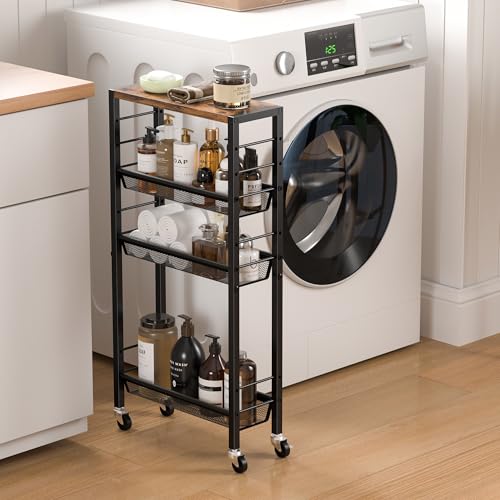 Slim Rolling Cart, 4-Tier Narrow Kitchen Storage Cart, Slim Utility Cart on Wheel, Skinny Bathroom Storage cart with Wood Tabletop, 6.0″ Deep, for Kitchen, Dining Room, Living Room, Laundry Room