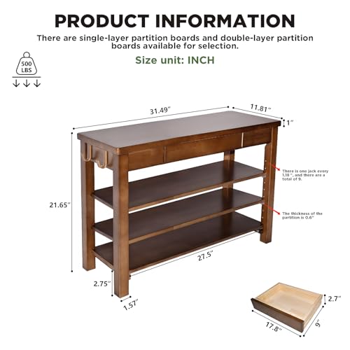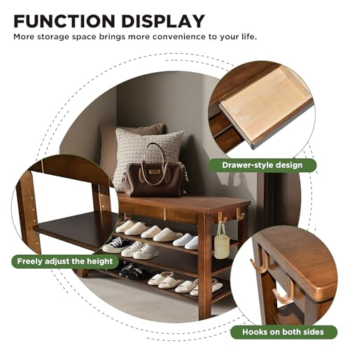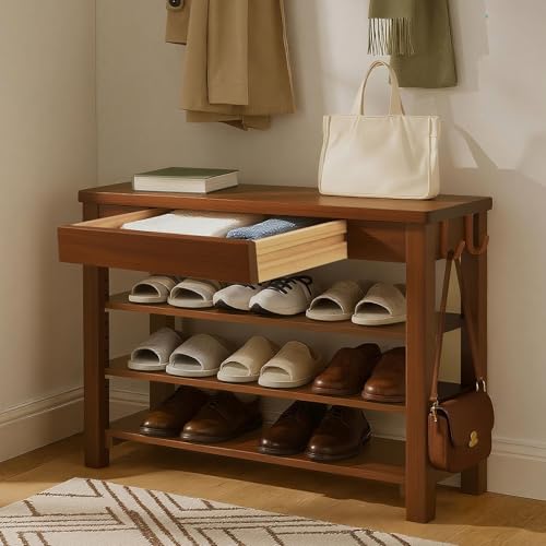 Wood Shoe Bench Entryway with Drawer: 3-Tiers Wooden Storage Shoe Rack with Bench Seat, Compact Mid-Century Modern Design for Entryway,Hallway,Closet,Front Door Entrance,Foyer Walnut 31.5″