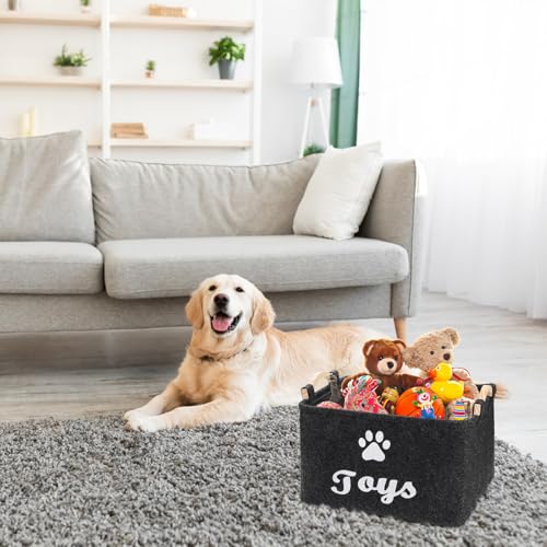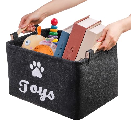Moderate Capacity: Come with 2 pieces felt toy boxes with wooden handles, each measures approx 15″L x 11″W x 8.6″H unfolded. Great for holding dog toys, dog treats, blanket or other pet supplies and keeping your house clean.
