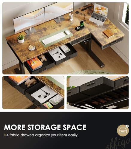 OffiGo 63 Inch L Shaped Electric Standing Desk with Drawers, Height Adjustable Large Desk with Power Outlets, Sit Stand Table, Writing Computer Desk for Home, Office, Workstation, Rustic Brown